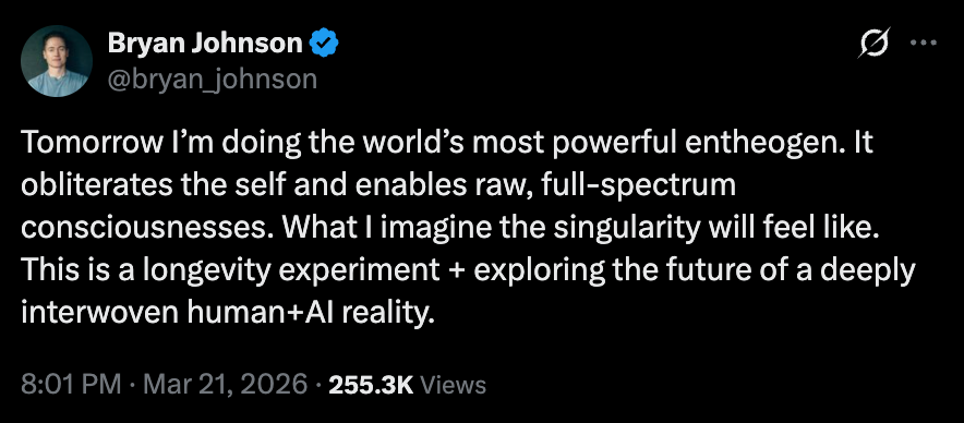 Then on March 21: “Tomorrow I’m doing the world’s most powerful entheogen. It obliterates the self and enables raw consciousness across the full spectrum. What I imagine the singularity will feel like.”
