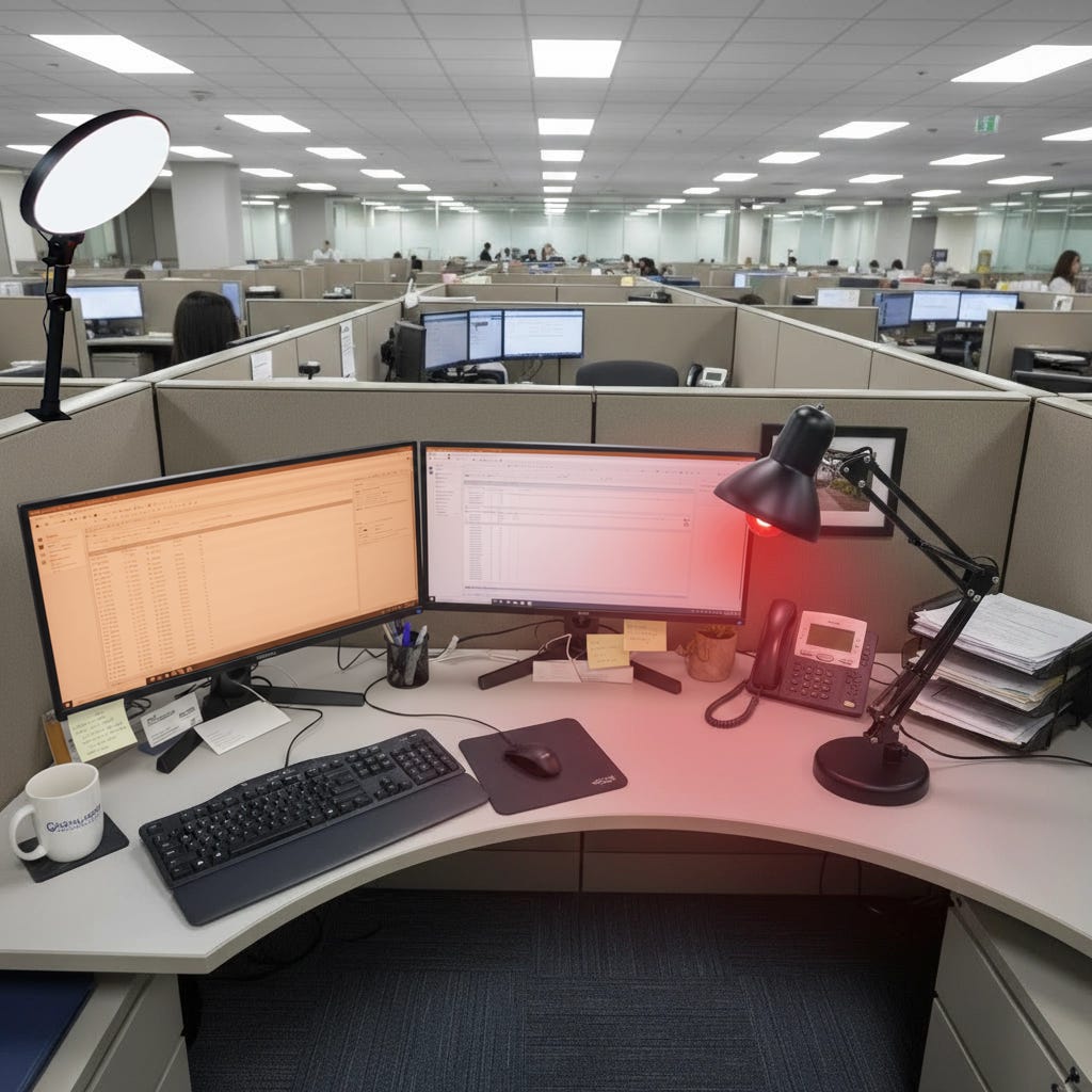 Are you sitting in a Fortune 500 office under 6000K LED panels that suppress your melatonin by 80%+? Has your testosterone has dropped 47% since you started this job? Your cortisol through the roof? DHT in the gutter? Insulin and leptin high, complete with stubborn lower belly fat and love handles that might as well be permanent?
